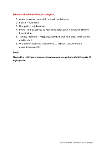 Idara ya Kiswahili Tender Care Junior Academy